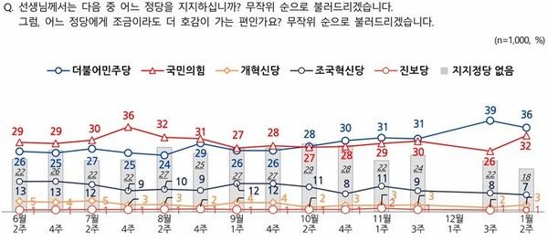 직전 조사인 지난해 12월 3주차와 비교하면 국민의힘 지지도는 26%에서 32%로 6%포인트(p) 상승했다. 민주당 지지도는 39%에서 36%로 8%p 하락했다. 이 기간 조국혁신당 정당 지지도는 8%에서 7%로 1%p 하락했다.