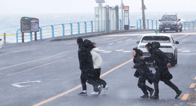 올겨울 들어 가장 추운 날씨를 보이고 있는 9일 오후 제주시 용담동 해안도로에서 관광객들이 눈발을 피해 급히 발걸음을 옮기고 있다. / 뉴스1