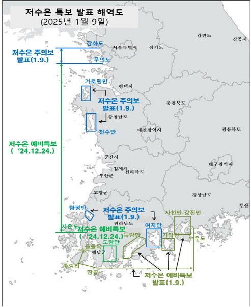 국립수산과학원(수과원)은 찬 대륙고기압이 남하하면서 발생하는 한파 영향으로 주요 해역의 수온이 하강함에 따라 이날 오후 1시 기준 인천 연안과 충남 가로림만, 천수만, 전남 함평만, 여자만 등 5개 해역에 저수온 주의보를 발표했다.