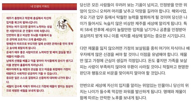 온라인 사주 전문 사이트 '위키사주'는 오랜 전통을 바탕으로 한 사주팔자와 현대적인 분석 기술을 결합하여 각자의 운명을 상세히 분석한다. 이름과 생년월일, 태어난 시간과 성별을 입력하면 간단하게 이용할 수 있다. 특히, 앞으로 3년 동안의 애정을 꿰뚫어볼 수 있는 애정운, 냉정하고 속시원한 궁합, 사랑에 관한 모든 것을 담은 타로까지 다양한 운세를 재미있게 점칠 수 있다.