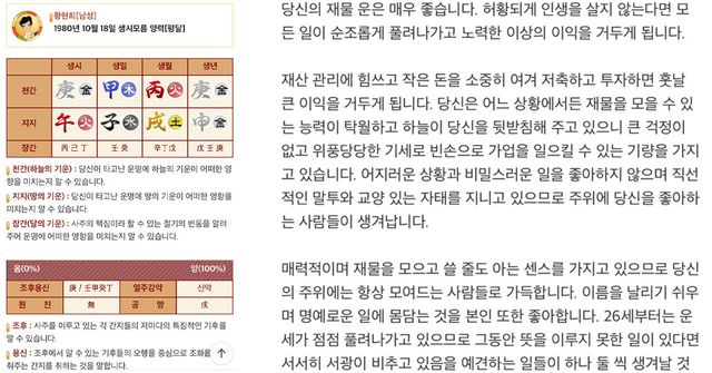위키사주 황현희 사주 화면 / 위키사주