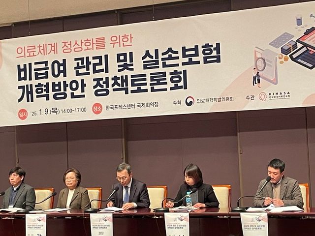 9일 대통령 직속 의료개혁특별위원회는 서울 중구 한국프레스센터 20층에서 '의료체계 정상화를 위한 비급여 실손보험 개혁 방안 정책토론회'를 개최했다. 토론회는 보건복지부·금융위원회·국민건강보험공단에 더해 보험연구원·손해보험협회·학계 관계자 등 다양한 전문가들이 자리했다.