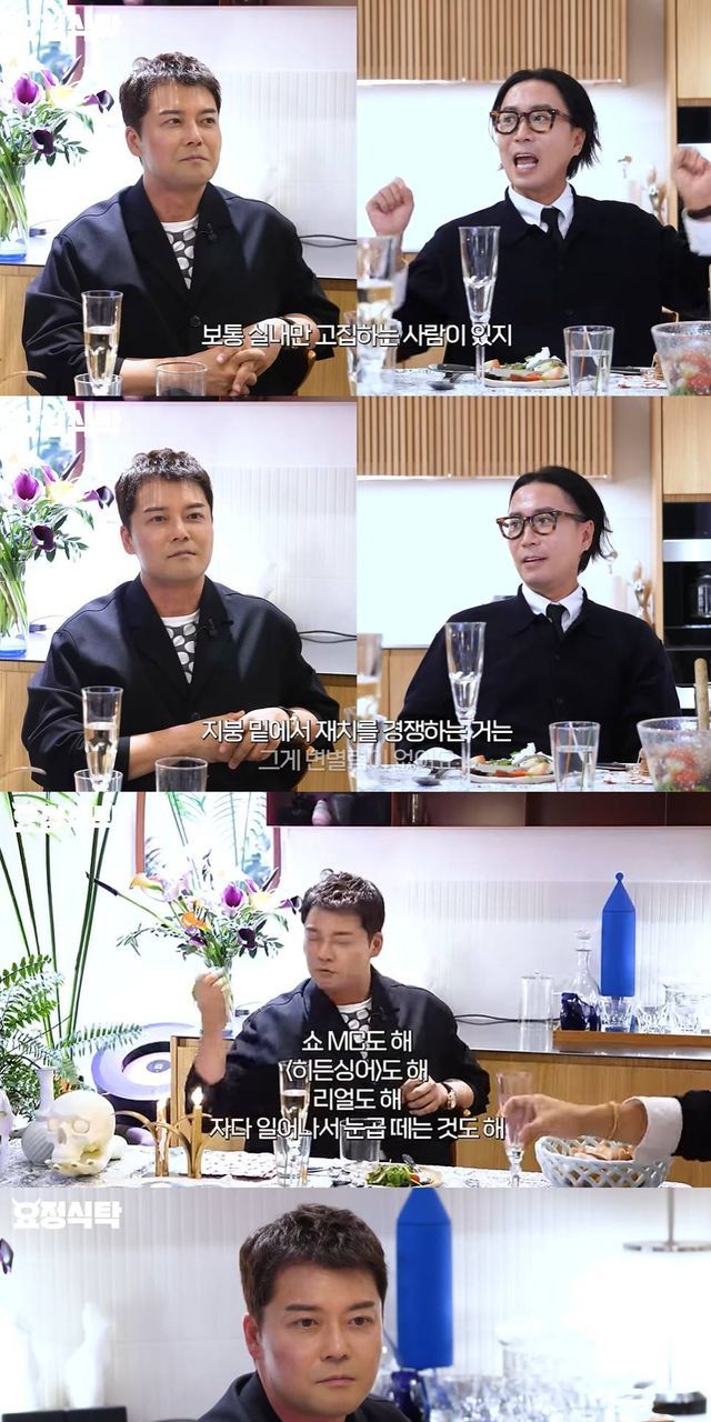 전현무는 "있다. 전략적이다. 왜? 무기를 하나 더 갖는 거다. 지붕 밑에서 재치를 경쟁하는 거는 사실은 변별력이 없다. 형도 진행해서 아시겠지만 MC로서 변별력 드러내기가 당연히 능력 차이가 있겠지만 변별력이 없다. 음악프로를 싱어게인, 복면가왕 빼고 다했다"라고 말해 감탄을 불러일으켰다.