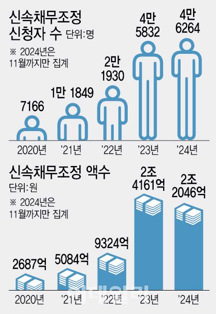 신속채무조정 액수도 증가세를 보였다. 지난 5년간 채무조정 액수는 2020년 2687억원에서 2021년 5084억원, 2022년 9324억원, 2023년 2조 4161억원으로 집계됐다. 2024년 채무조정액수는 11월까지 2조 2046억원이다.