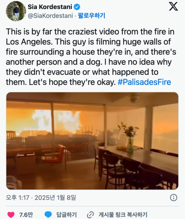 LA 산불 현장을 촬영한 사진과 영상이 SNS와 언론을 통해 퍼지면서 충격이 확산되고 있다. 특히 SNS에 올라온 한 영상은 대중들에게 큰 충격을 주었다.