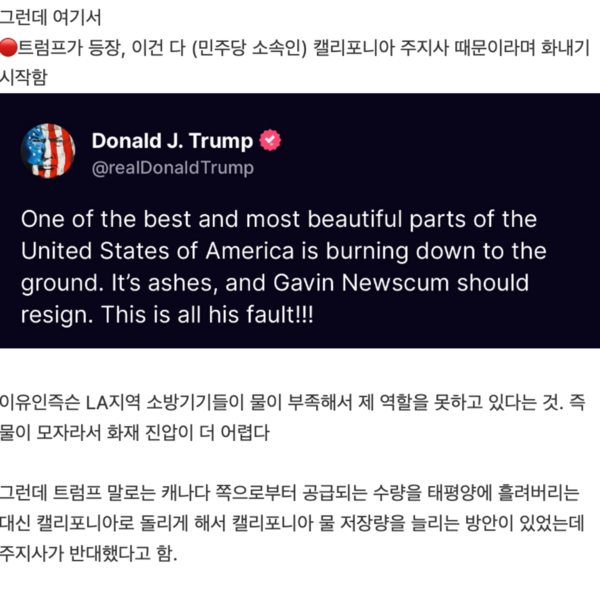 트럼프는 최근 자신의 소셜미디어를 통해 “미국에서 가장 아름다운 지역 중 하나인 캘리포니아가 불타고 있다.