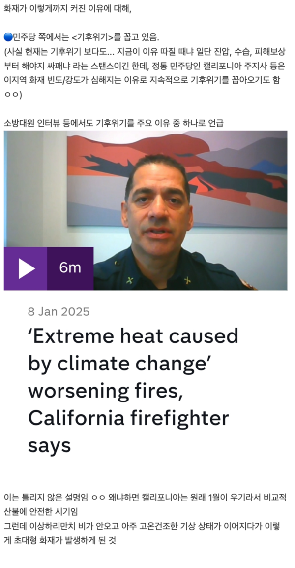 민주당 측에서는 기후변화로 인한 고온 건조한 날씨와 강풍이 산불을 키운 주요 원인이라고 주장하고 있다.