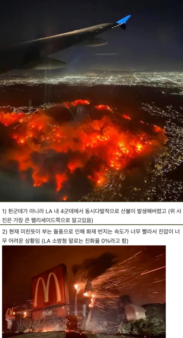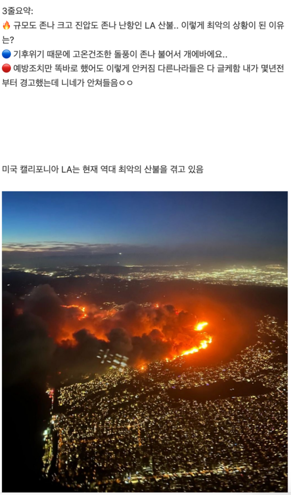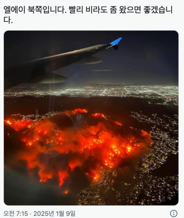 또 다른 SNS 사용자도 “비행기에서 촬영한 LA 북부 지역의 산불 사진을 보면 도시 전체가 불길에 휩싸인 것처럼 보인다”며 “빠르게 비라도 내려서 불길을 잡아주길 바란다”고 전했다.
