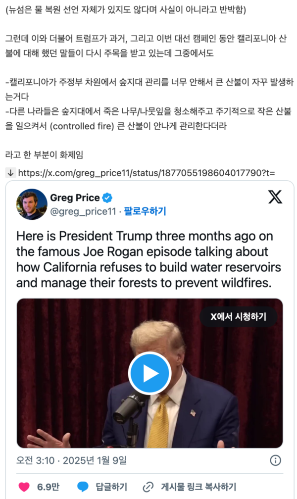 특히 도널드 트럼프 전 대통령은 과거부터 “캘리포니아는 숲 관리가 제대로 되지 않아 산불이 반복적으로 발생하고 있다”고 지적해왔다.