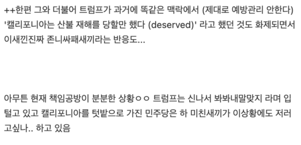 트럼프는 또한 “다른 나라들은 숲 관리 차원에서 죽은 나무와 나뭇잎을 청소하고, 통제된 작은 불을 내어 대형 산불을 방지한다.