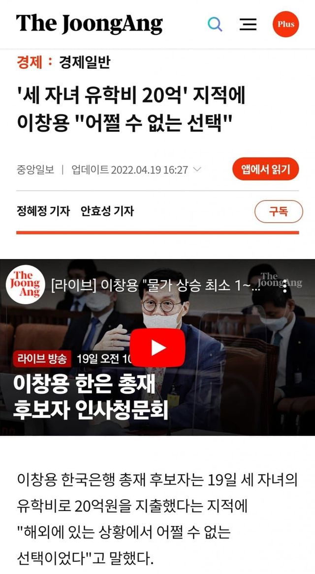 유학비만 20억씩 쓰는 이창용 한국은행 총재