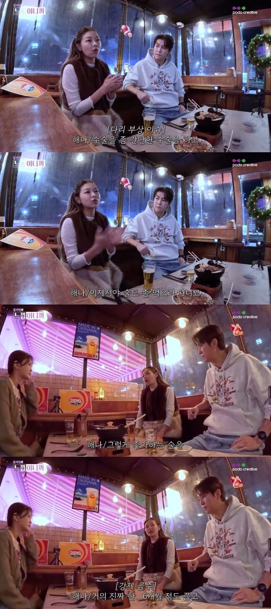 공개된 영상에서 송해나는 근황에 대해 "요즘 간단한 수술을 좀 하고 그 다음에 회복이 돼서 이제서야 술도 좀 먹으러 다닌다"면서 "다리 수술을 해서 그 좋아하는 술을 한 6개월 정도 끊었다"고 전해 모두를 놀라게 했다.