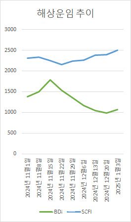 반면 대표적인 컨테이너 화물 운임지수인 상하이컨테이너운임지수(SCFI)는 견조한 흐름을 나타내고 있다. 지난 3일 기준 SCFI는 2505.17을 기록하며 지난해 9월13일(2510.95) 이후 석달 만에 2500선을 돌파했다.