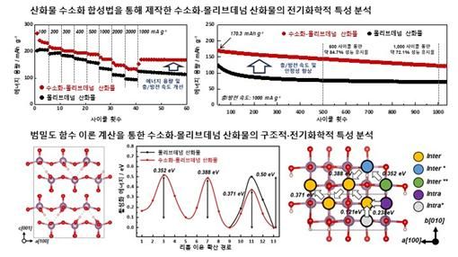 또한 전기화학 및 분광학 기초실험을 통해 도핑된 수소 이온이 몰리브데넘 산화물의 충·방전 시 발생하는 결정 구조의 붕괴 반응을 제한해 배터리 사이클 안정성이 크게 개선됐음을 확인했다.