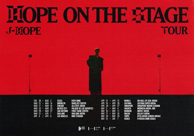방탄소년단 제이홉은 10일 글로벌 슈퍼팬 플랫폼 위버스(Weverse)에 'j-hope Tour 'HOPE ON THE STAGE''(이하 'HOPE ON THE STAGE') 포스터를 게재하며 월드투어 개최 소식을 전했다. 'HOPE ON THE STAGE'는 오는 2월 28일~3월 2일 서울 송파구 KSPO DOME에서 화려하게 포문을 연다. 3회 모두 오프라인 공연과 온라인 라이브 스트리밍이 병행된다. 이어 브루클린, 시카고, 멕시코 시티 등 북미를 비롯해 마닐라, 사이타마, 싱가포르, 자카르타, 방콕, 마카오, 타이베이, 오사카까지 총 15개 도시에서 31회 공연으로 전 세계 팬들과 만난다.