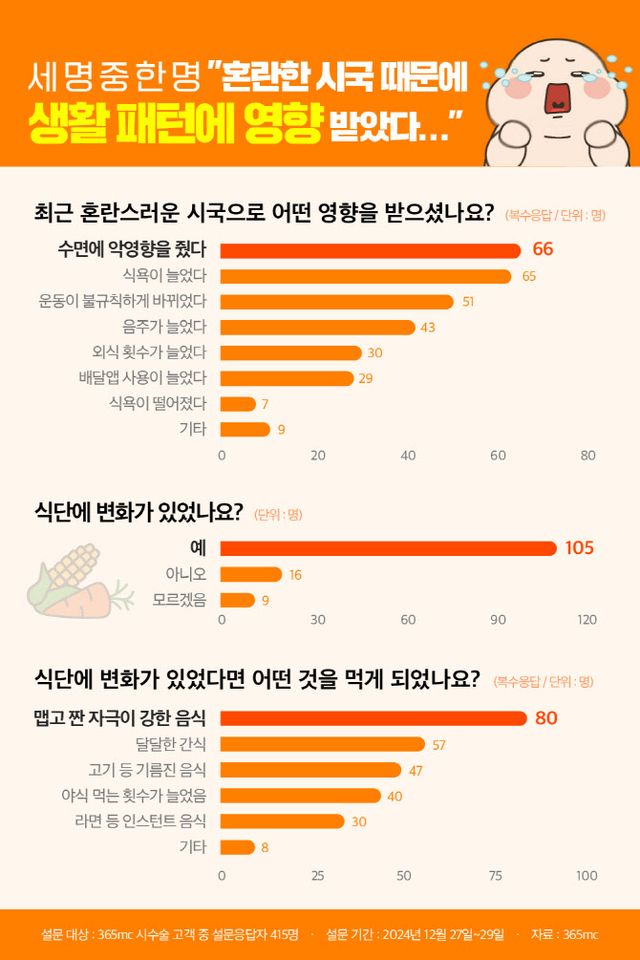 365mc는 국내 정세가 안정되지 않은 상황이 개인의 심리와 생활습관에 어떤 영향을 주고 있고 개인의 건강한 생활을 위해 어떤 노력이 필요한지를 알아보기 위해 설문조사를 실시했다. 365mc의 전국 네트워크인 서울, 대구, 인천, 대전, 부산 병원을 방문한 20~60대 성인 고객 415명을 대상으로 12월 27일부터 3일간 진행했다. 응답자의 95.4%가 여성이었다.