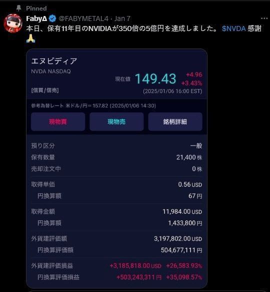 A씨는 지난 2013년 150만엔(약 1380만원)을 투자해 0.56달러에 엔비디아 주식을 샀다. 엔비디아 주가는 지난 6일 기준 149달러로 치솟으면서 A씨의 전체 수익은 11년 만에 350배로 불어났다. 엔화로 5억엔(약 46억5000만원)에 달하는 금액이다.