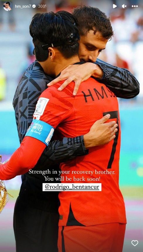 (엑스포츠뉴스 나승우 기자) 지난 여름 불거졌던 인종차별 논란에도 손흥민과 로드리고 벤탄쿠르의 우정은 여전히 두텁다. 손흥민이 뇌진탕 증세로 병원에 실려간 벤탄쿠르를 위로했다.