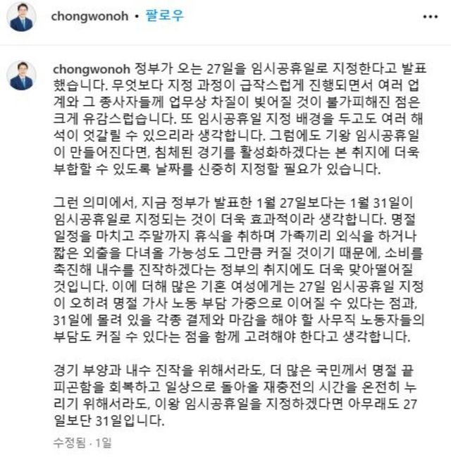 정원오 서울 성동구청장은 정부가 설 연휴 전날인 1월 27일을 임시공휴일로 지정한 것에 대해 "1월 31일이 더욱 효과적"이라고 주장했다.