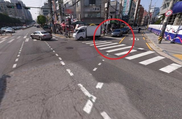 10일 <일요시사> 취재 결과 이날 사고 발생 지점은 서울 동작구 소재의 4차선 보라매로와 연결된 2차선의 30km 제한 골목길로, 횡단보도 앞엔 정지선까지 명확히 그어져 있다. 블랙박스에 기록된 횡단보도의 형태를 봤을 때 A씨는 정지선 앞에 정차 중이었던 것으로 추정된다.