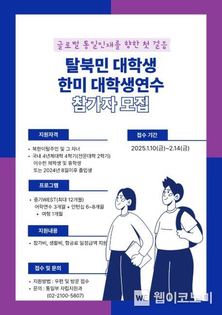 (웹이코노미) 통일부는 글로벌 시대의 핵심인재 양성을 위해 탈북민 대학생이 참여하는 '한미 대학생연수(WEST: Work, English Study, Travel)' 프로그램을 5년 만에 다시 시작한다.