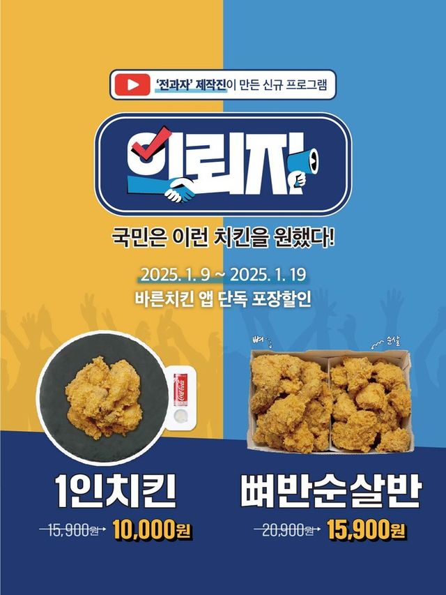 바른치킨은 '의뢰자'를 통해 두 가지의 신개념 치킨 메뉴를 의뢰 받았다. 국민치킨으로 선정된 두 가지 치킨은 자취생과 혼밥족을 위해 알찬 구성과 가성비를 자랑하는 '1인치킨'과 한 마리에 뼈와 순살 모두를 담아 다양한 기호를 만족시킬 수 있는 '뼈반순살반 현미바삭'이다.