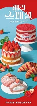 기존 인기 베이커리에 딸기를 더한 제품도 출시된다. △겹겹이 쌓인 반죽 사이에 딸기잼과 아몬드크림을 더한 쿠키 식감의 크라상 '딸기잼 아몬드 크라상' △초콜릿 풍미 가득한 맘모스빵에 딸기를 더해 초콜릿, 딸기, 바닐라 우유크림이 조화로운 '초코베리 맘모스' △진한 티라미수 크루아상에 딸기잼과 신선한 딸기를 얹은 '생딸기 티라미수크라상' △고소한 크루아상 속에 부드러운 우유크림과 딸기잼을 넣고 딸기를 더한 '생딸기 우유크림크라상' 등이다.