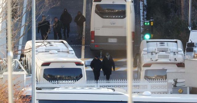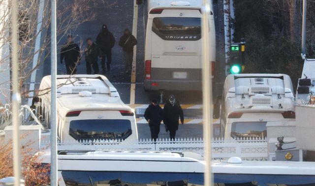 내란수괴 혐의를 받는 윤석열 대통령에 대한 체포영장이 재발부된 가운데 9일 오전 서울 용산구 한남동 대통령 관저에서 차벽을 세우기 위해 동원된 버스 차량 옆으로 경호처 등 관계자들이 이동하고 있다. / 뉴스1