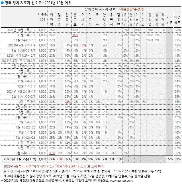 한국갤럽은 “현 정부 출범 후 여권에서 가장 주목받아온 한 전 비대위원장은 지난해 3월 선호도 조사에서 지지율이 24%에 달했으나, 총선 후 줄곧 10%대에 머물다 탄핵안 가결·당대표 사퇴 이후 한 자릿수대에 머물고 있다”고 설명했다.