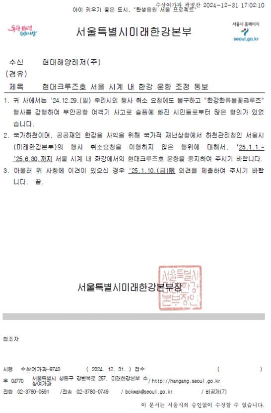 서울시는 지난해 12월 30일, “무안국제공항 제주항공 여객기 사고 당일(29일) 현대해양레져가 시의 의견을 무시하고 불꽃쇼를 강행했다”며 “서울시계 내 6개월간 유람선 영업정지와 협력사업 전면 중단이라는 강한 처분을 내리겠다"고 발표했다.