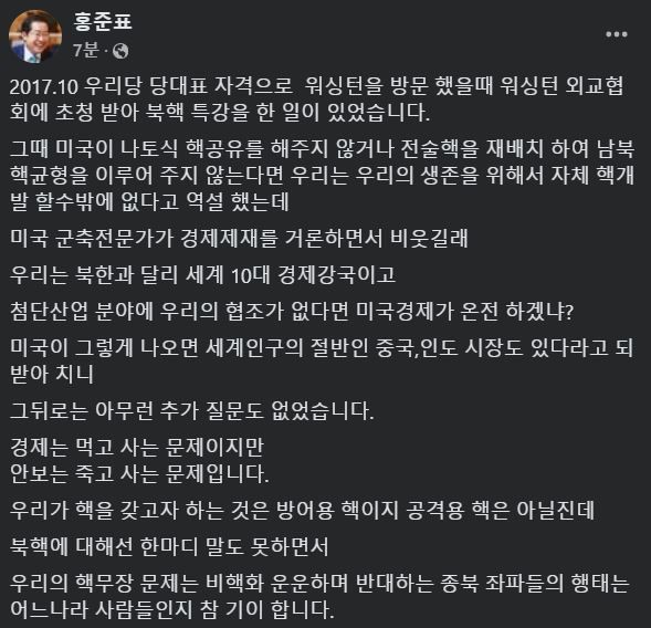 "핵을 보유한 국가끼리 전쟁은 불가능하다"며, '독자 핵무장론'을 제기해 온 것으로 알려진 홍 시장은 핵무장에 반대하는 측을 비판하기도 했다.