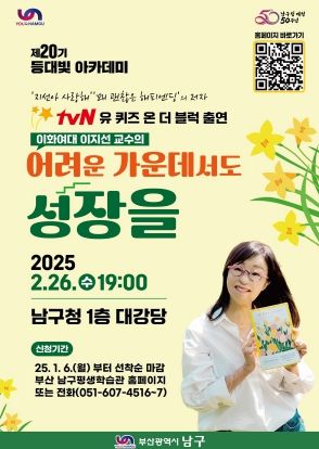 [파이낸셜경제=김영란 기자] 부산 남구는 오는 2월 26일, 남구청 1층 대강당에서 이화여대 이지선 교수를 초청하여 구민을 대상으로 하는 제20기 등대빛 아카데미 첫 강의를 개최할 예정이다.