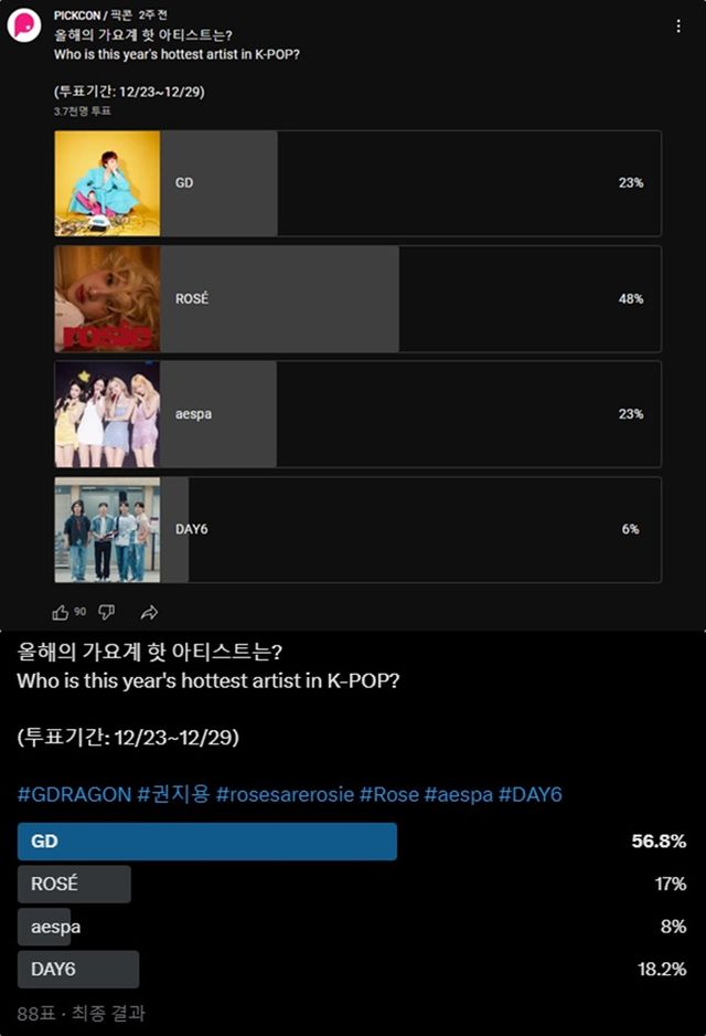 지난달 23일부터 29일까지 일주일 간 픽콘 유튜브 채널 커뮤니티와 X(구 트위터)를 통해 '올해의 가요계 핫 아티스트는?'이라는 주제로 올해 화려한 컴백을 알린 지드래곤, 첫 솔로 정규 앨범으로 화제를 모았던 블랙핑크 로제, 지난해 3연타석 히트를 완성한 에스파, 밴드 열풍을 일으킨 데이식스를 후보로 선정해 투표를 진행했다.