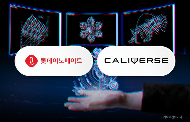 롯데이노베이트 메타버스 자회사 칼리버스가 엔비디아, 메타 등 글로벌 기업들과 협력을 논의했다. 그래픽=이찬희 기자
