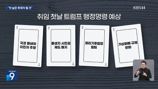 국경 폐쇄와 이민자 추방, 미국에서 태어나면 시민권을 주는 '출생지 시민권 제도' 폐지, 파리기후 협정 탈퇴, 가상화폐 규제 완화 등이 트럼프가 즉시 실행할 행정명령으로 예상됩니다.