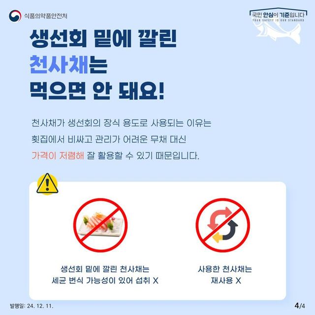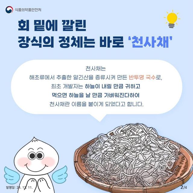 천사채는 많은 사람에게 익숙하지만 정확히 무엇인지 아는 사람은 많지 않다. 식품의약품안전처는 최근 카드뉴스를 통해 천사채 섭취와 관련된 유의사항을 발표해 회 밑에 깔린 천사채를 먹는 것이 안전하지 않을 수 있다고 경고한 바 있다.