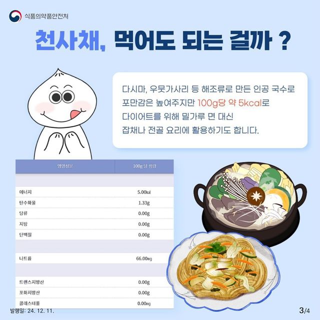실제로 천사채는 저칼로리 식품이다. 칼로리가 100g당 약 6~10kcal로 매우 낮아 다이어트 식품으로 제격이다. 식이섬유와 칼슘, 마그네슘, 칼륨 같은 무기질이 포함돼 변비 해소와 무기질 보충에 도움을 줄 수 있다. 베이킹소다를 활용해 당면처럼 조리할 경우 저칼로리 당면으로 즐길 수도 있다.