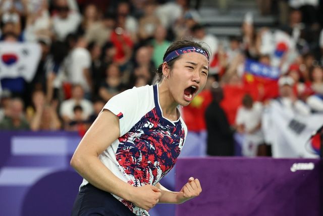 지난해 8월 5일(현지시간) 프랑스 파리 포르트드 라 샤펠 아레나에서 열린 2024 파리올림픽 배드민턴 여자 단식 결승전에서 한국 안세영이 중국 허빙자오를 이기고 우승을 확정한 뒤 기뻐하고 있다. / 연합뉴스