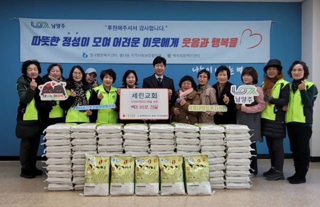 [와이뉴스] 남양주시 별내동 세린교회는 지난 9일 관내 취약계층 지원을 위한 쌀 85포(850kg)를 기부했다.