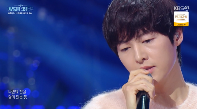 가장 의미 있는 노래를 묻자 송중기는 “위로받고 기대고 싶을 때 보는 드라마가 있다. ‘나의 아저씨’다”라며 “OST중에 곽진언 씨가 리메이크한 ‘내마음에 비친 내모습’ 들려주고 싶어서 골라봤다”라면서 무대를 선보였다.
