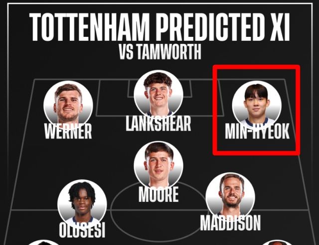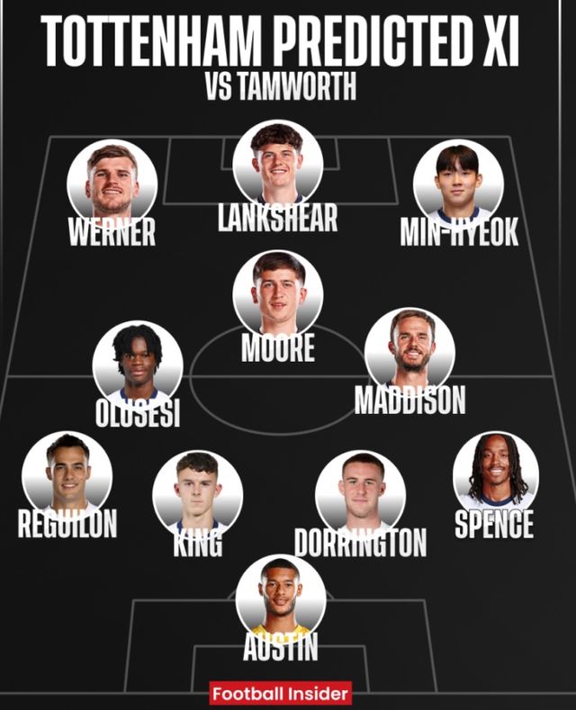 매체가 예상한 토트넘의 탬워스전 선발 라인업은 4-2-3-1 전형으로 구성됐다. 안토닌 킨스키가 골문을 지키고, 제드 스펜스, 알피 도링턴, 라두 드라구신, 세르히오 레길론이 백4를 구성한다. 3선은 파페 사르와 루카스 베리발이 지키고, 2선에 마이키 무어, 제임스 매디슨, 티모 베르너가 배치. 최전방에서 윌 랭크셔가 탬워스 골문을 노릴 것으로 예상했다.