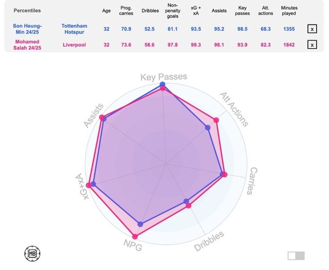 매체는 ▲공격적 운반 ▲드리블 ▲논 페널티킥 골 ▲기대득점+기대어시스트 ▲어시스트 ▲키패스 ▲공격적 액션 등 7개 분야에 걸쳐 둘의 수치를 비교했는데 손흥민은 키패스에선 살라를 오히려 앞서고 '기대득점+기대어시스트'에서도 거의 대등한 수치를 나타내는 등 실력이 녹슬지 않았음을 알렸다.