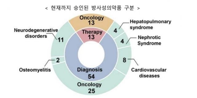 현재 미국식품의약국(FDA) 허가를 받은 방사성의약품은 총 67개다. 이 중 54개는 질병 진단용으로 13개는 치료용으로 사용되고 있다.
