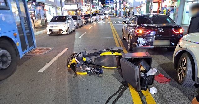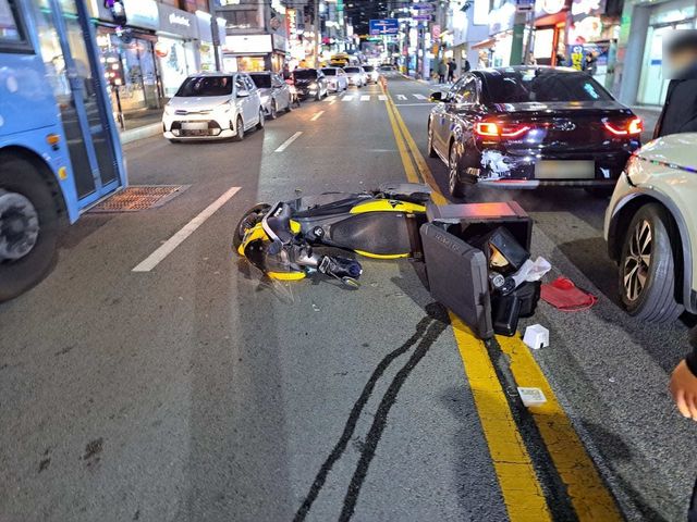 지난 10일 오후 7시 20분께 부산에서 음주 뺑소니 사고를 낸 A씨가 들이받아 넘어진 오토바이 / 부산경찰청 제공