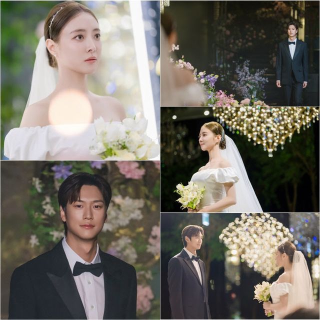 이와 함께 마치 찬란한 동화 속의 한 장면 같은 두 사람의 모습이 탄성을 자아낸다. 먼저 순백의 신부로 변신한 강희는 오프숄더 웨딩드레스와 단정한 업스타일 헤어로 청초한 아름다움을 유감없이 뽐내는 모습. 반짝이는 샹들리에와 새하얀 웨딩드레스 속에서 한층 빛을 발하는 강희의 다갈색 눈동자와 머리칼이 신비로운 매력을 드러낸다. 반면 턱시도를 차려입은 연수는 왕자님 같은 모습으로 여심을 저격한다. 무엇보다 강희를 향한 순정이 고스란히 묻어나는 따뜻한 눈빛이 ‘첫사랑 판타지’를 제대로 자극한다.