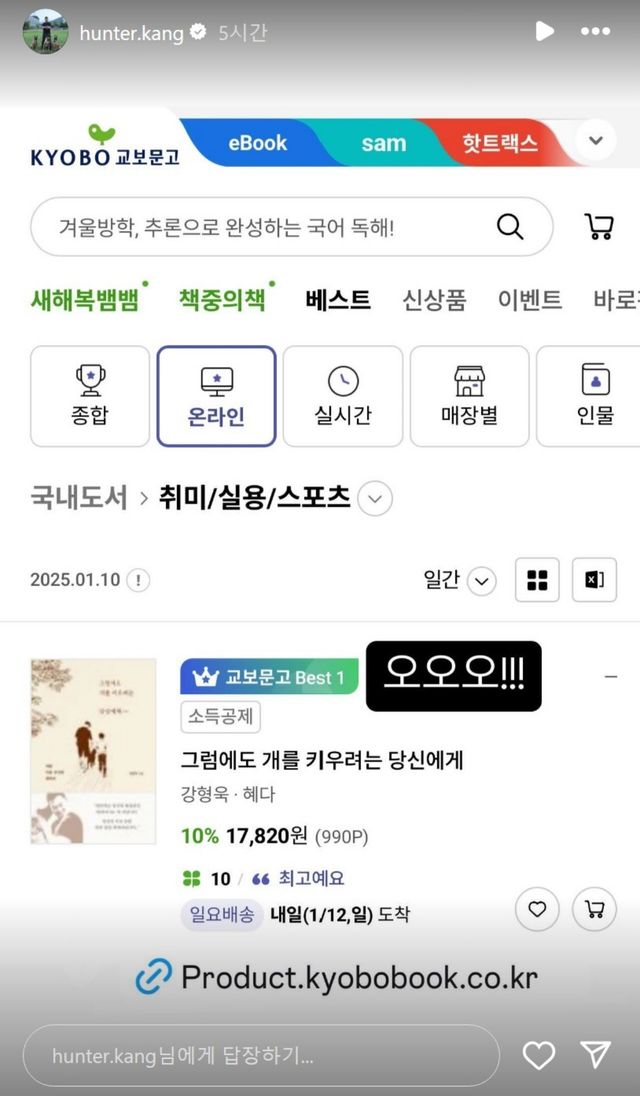 강형욱이 11일 자신의 인스타그램 스토리를 통해 알린 책 베스트셀러 1위 등극 소식 / 강형욱 인스타그램
