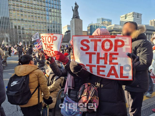 추운 날씨에 장갑과 모자 등으로 무장한 이들은 ‘주사파에 속지 말자’ ‘이재명을 체포하라’ 등이 적힌 포스터를 들었다. 또 ‘Stop the Steal(도둑질을 멈춰라)’고 적힌 영어 손팻말도 흔들었다. 이는 도널드 트럼프 미 대통령 당선인이 지난 2020년 미 대선 부정선거 의혹을 제시하며 주장한 문구다. 참가자들은 대형 스크린에 뜬 성조기를 보며 스피커에서 흘러나오는 미국 국가를 따라 부르기도 했다. 다만 이를 지켜보던 한 30대 시민 A씨는 “미국 국가를 왜 트는 건지 이해가 안 간다”고 말했다.