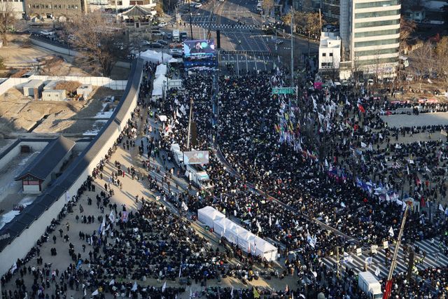 한편 경찰은 양측 충돌을 막기 위해 차벽과 펜스 등으로 통행로를 나누기도 했다. 또 청계천 광장의 조형물 위에 올라선 집회 참가자들을 제지하기도 했다. 이날 오후 4시30분 기준 경찰 비공식 추산에 따르면 윤 대통령 탄핵 반대 집회에는 3만2천명이, 찬성 집회에는 1만9천명이 결집했다. 앞선 촛불행동 집회에는 오후 2시 기준 경찰 비공식 추산 9천명이 모였다.