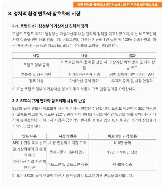 우선 ‘트럼프 2기 행정부 출범 이후 비트코인 가격을 분기별로 전망해달라’고 구버에 요청했다. 구버는 1분기 트럼프 대통령 취임 후 가상자산 우호 정책 발표에 대한 기대감으로 가격이 상승하거나 보수적으로 예측했을 땐 9만8000달러에서 안정세를 보일 것으로 내다봤다. 2분기에는 구체적인 정책이 발표되면서 상승세가 가팔라져 12만 달러까지 오르고, 3분기에는 15만 달러, 4분기에는 20만 달러까지 치솟을 거라고 예상했다. 답변과 함께 30건에 이르는 출처(레퍼런스) 가 제시돼, 답변의 정확도와 신뢰도를 체크할 수 있었다.