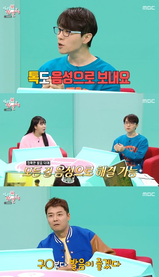 남도형 성우는 "음성 인식 굉장히 많이 쓰고 있다"라며, "톡도 음성으로 보낸다. 이거 하고 나면 손으로 못한다"라고 전했다.